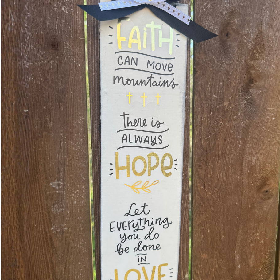 A beautifully handcrafted wooden sign featuring an inspiring message of faith, hope, and love, designed to uplift and encourage. Accented with elegant gold details and a decorative ribbon, this piece blends meaningful scripture with a modern farmhouse style. Perfect for adding a warm, faith-filled touch to any room or gifting to someone special.